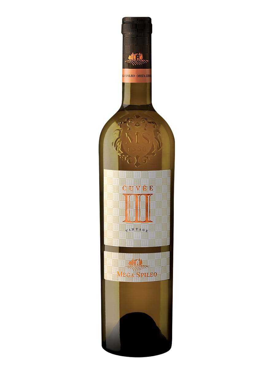 Το Κτήμα Μέγα Σπήλαιο Cuvée III Λευκό είναι ένας ποικιλιακός οίνος από Μαλαγουζιά (60%), Ασύρτικο (20%), Chardonnay (20%). Έχει αχυρο-κίτρινο χρώμα με πρασινωπές ανταύγειες. Η μύτη του είναι εκφραστική με πολύπλοκα αρώματα όπως νότες λευκών ανθών, φρέσκα πυρηνόκαρπα φρούτα, βασιλικό και θυμάρι. Στο στόμα η δροσερή οξύτητα ισορροπεί σε φρουτένιες γεύσεις. Στο τελείωμα έχει μακρά «βανιλάτη» επίγευση.