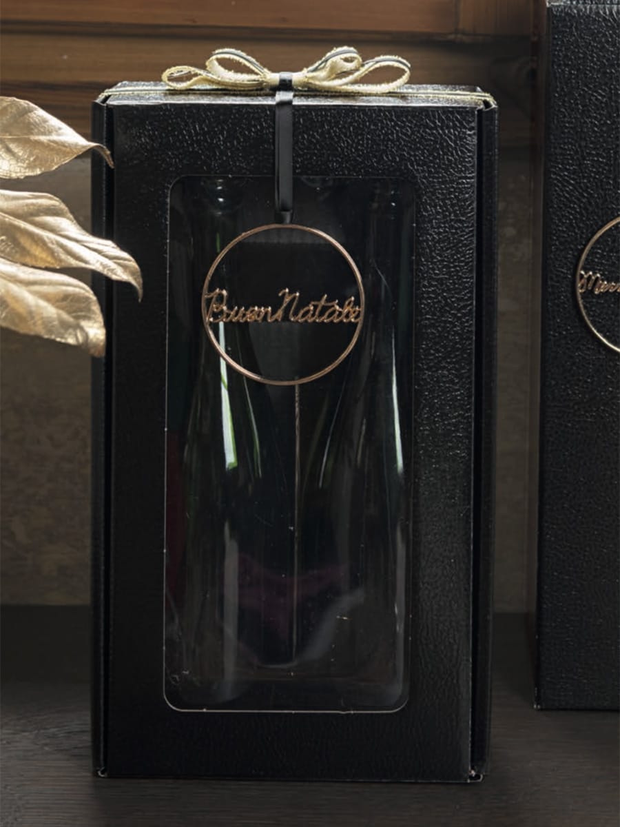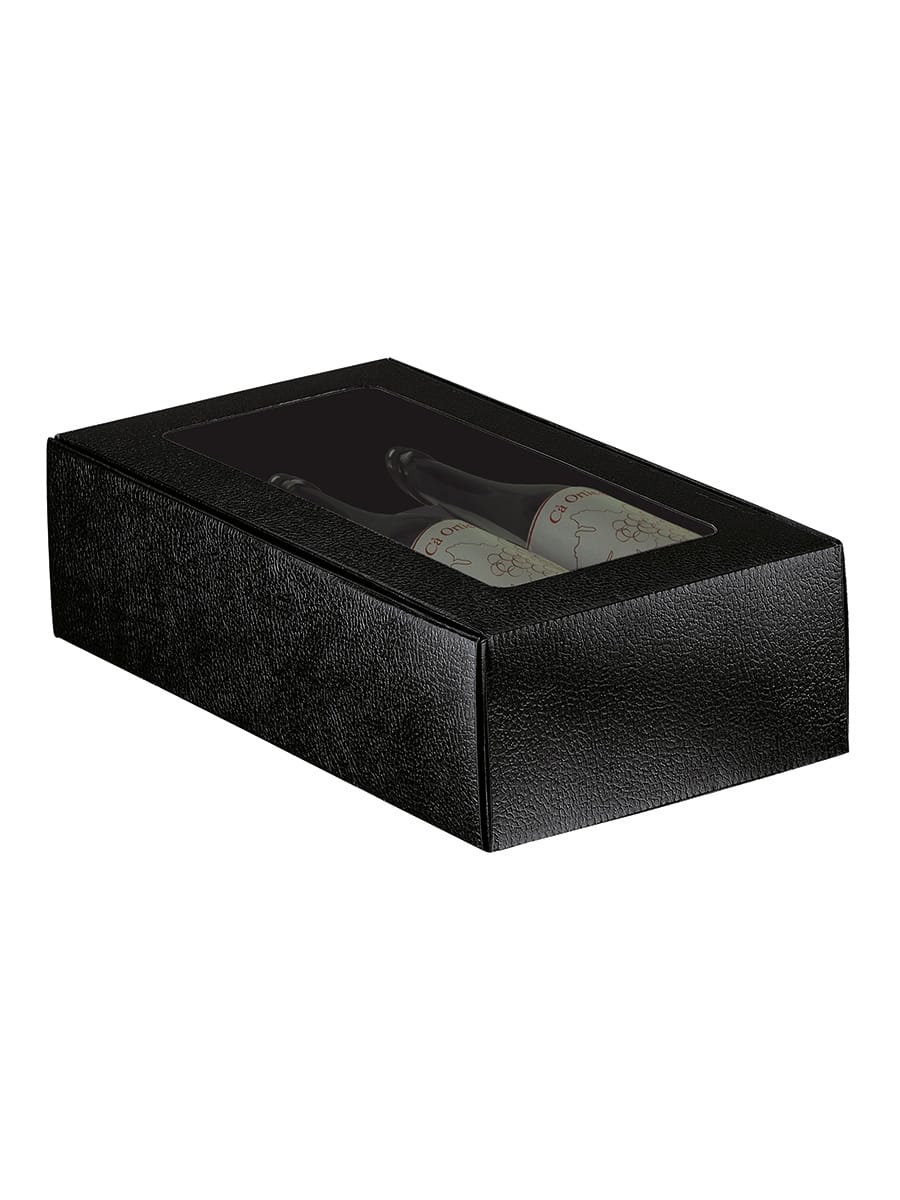 Κασετίνα δώρου 2 φιαλών κρασιού με διαφάνεια από πολυτελές ανάγλυφο σκληρό χαρτόνι. Ταιριάζει σε όλους τους τύπους φιαλών.